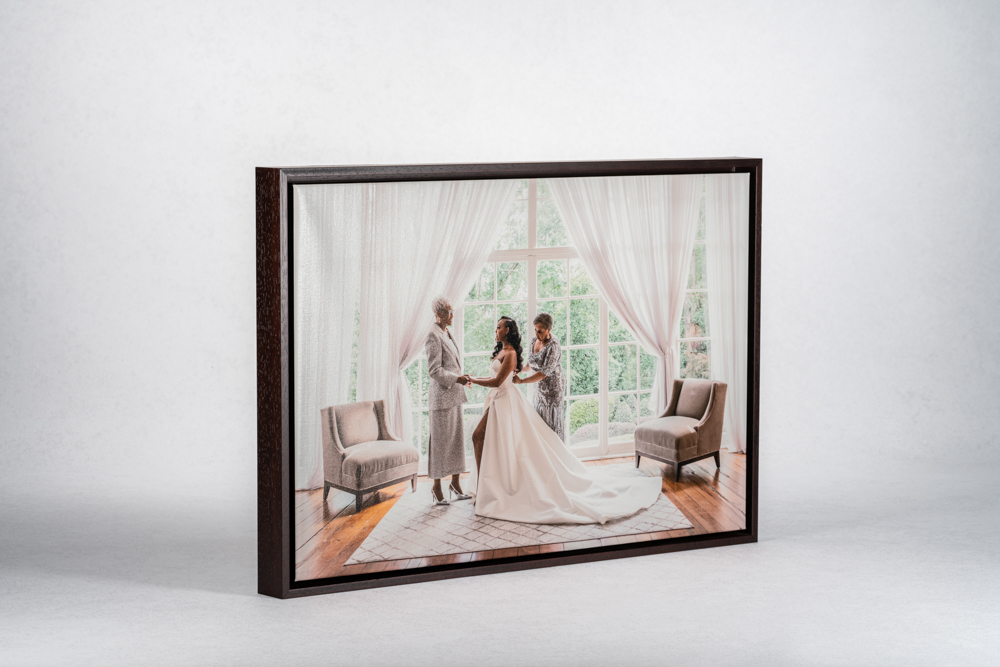 The deep set wood frame surrounds the canvas wrap and provides a beautiful finished and ready-to-hang product for your customer.