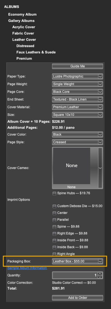 - Leather box will appear as an option when ordering a Gallery Album in hhstudio